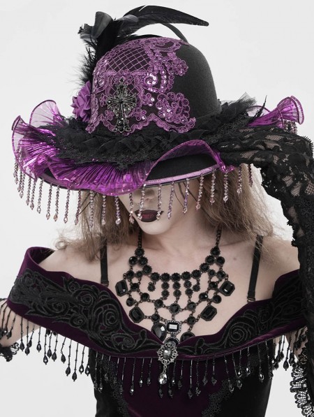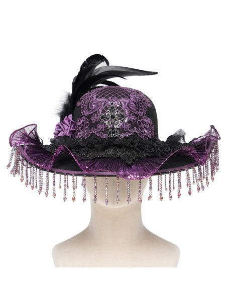 Eva Lady Black and Purple Vintage Gothic Frilly Feather Beaded Tassel Hat