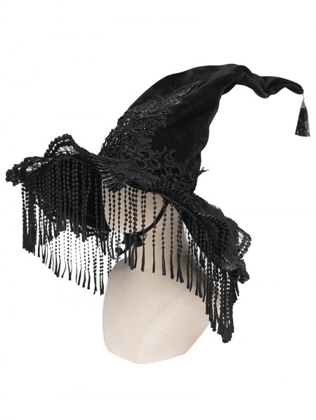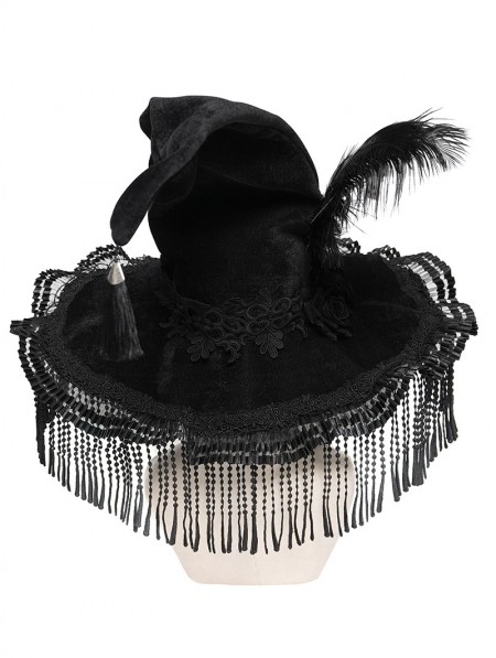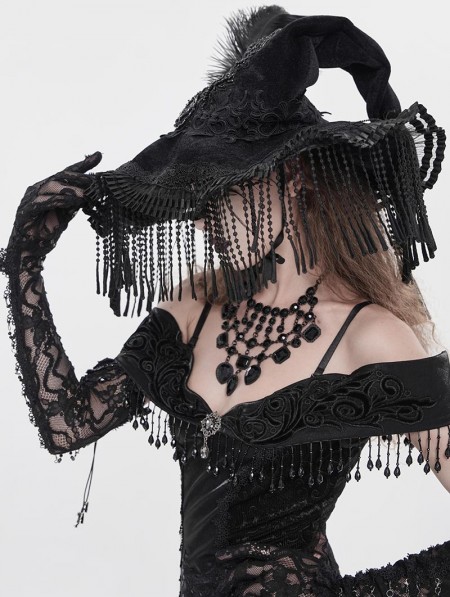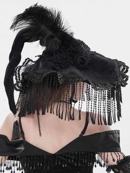 Eva Lady Black Victorian Gothic Witch Beaded Fringe Feather Hat