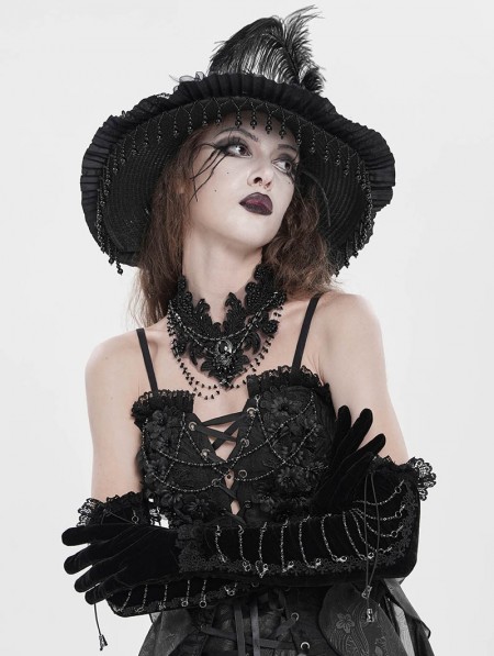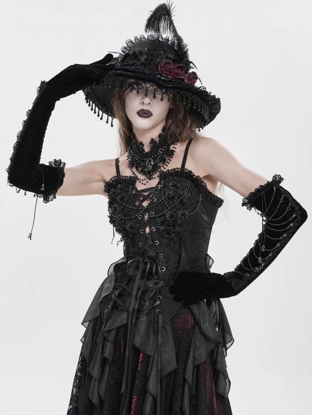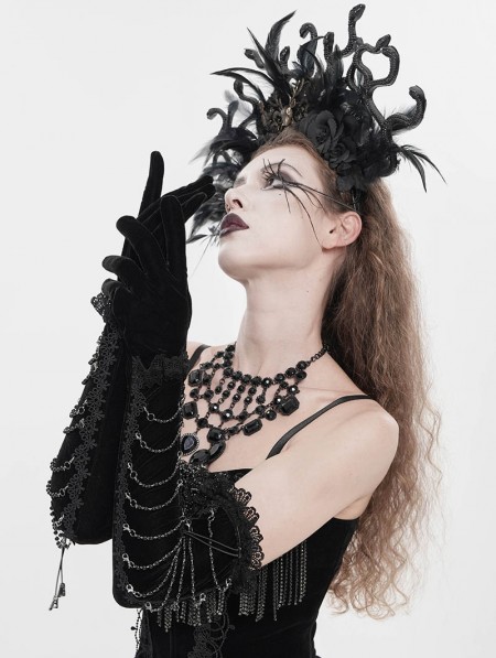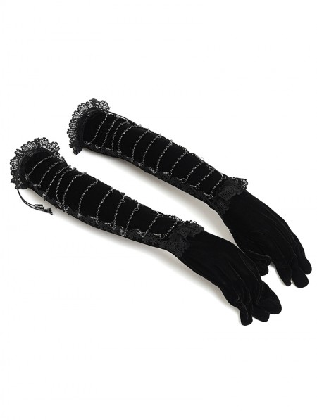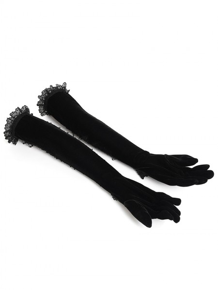 Eva Lady Black Gothic Retro Lace Appliqued Velvet Gloves