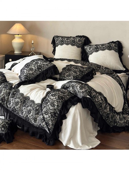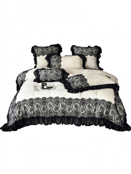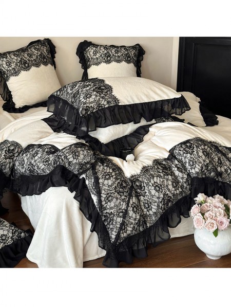 Ivory and Black Vintage Ruffled Lace Patchwork Comforter Set