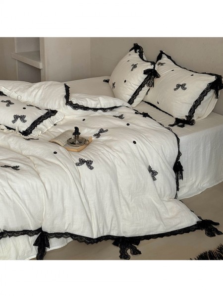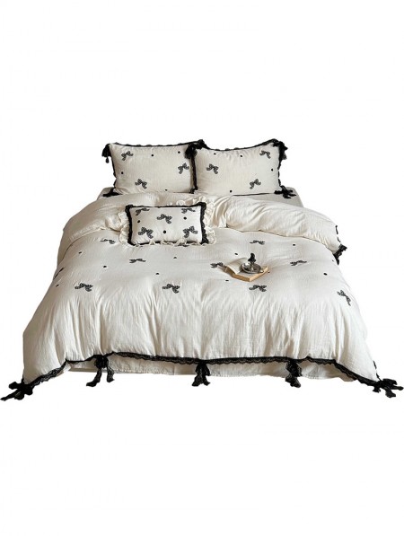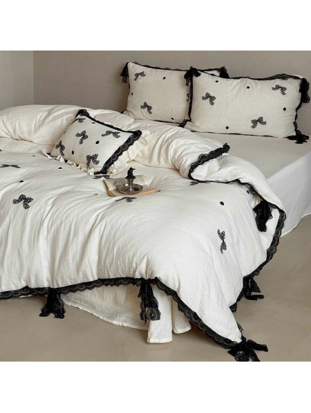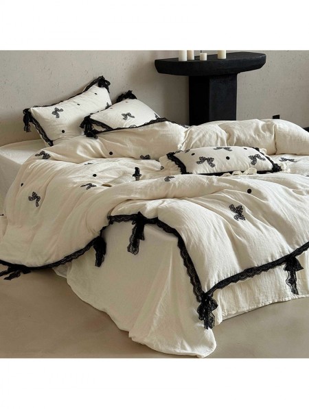Beige Princess Style Embroidered Lace Bow Bedding Set
