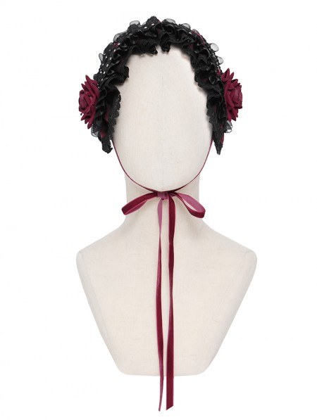 Devil Fashion Black and Red Gothic Rose Lace Bonnet Headband
