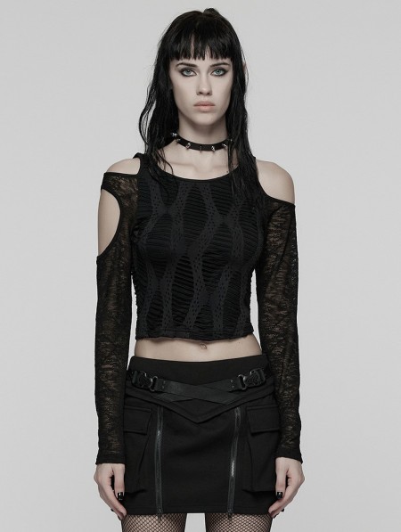 Punk Rave Black Gothic Daily Punk Irregular Hollow-Out Short T-Shirt for Women