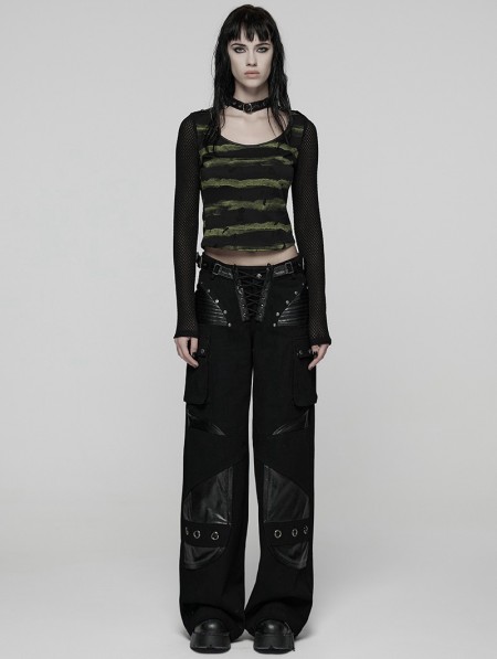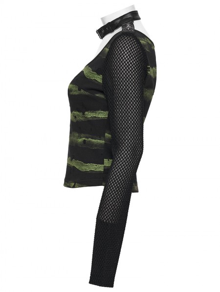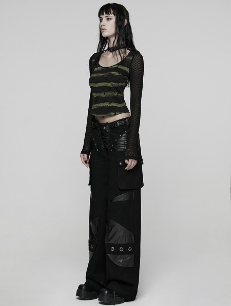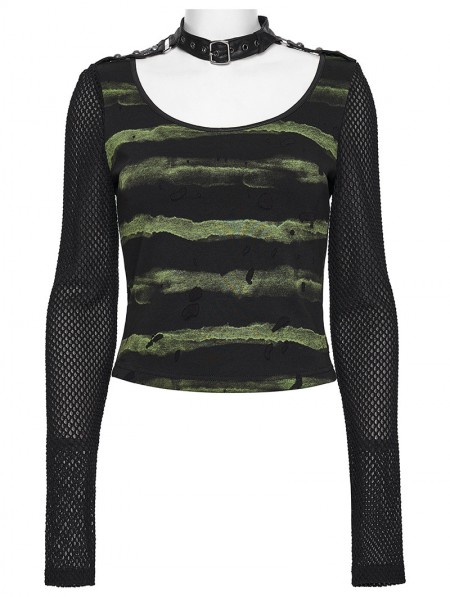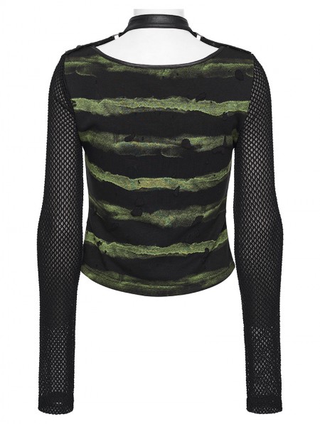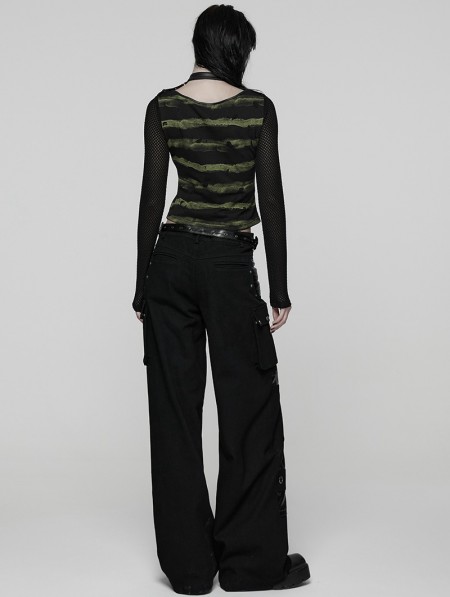 Punk Rave Black and Green Gothic Punk Stripe Short T-shirt for Women