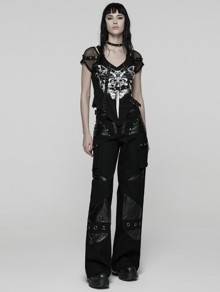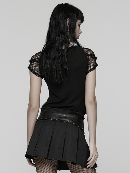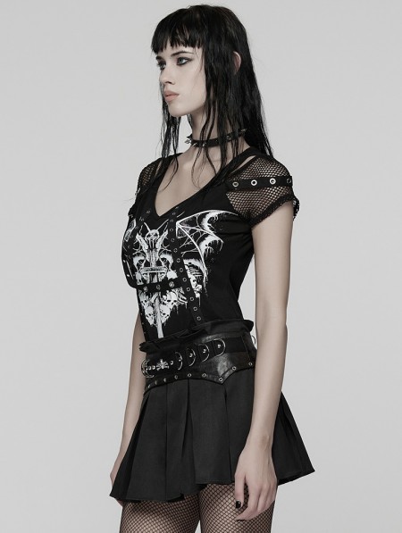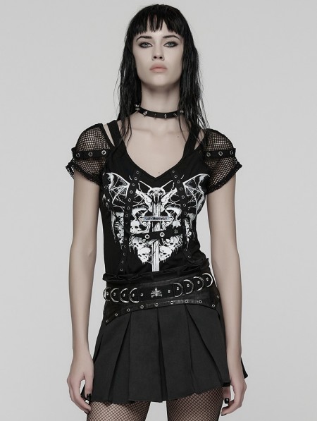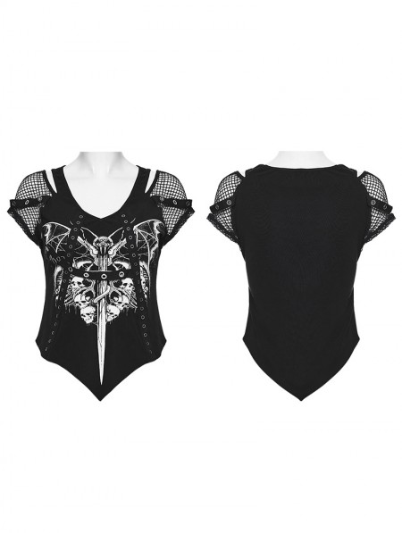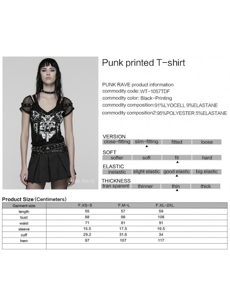 Punk Rave Black Gothic Punk Printed Mesh Spliced T-shirt for Women
