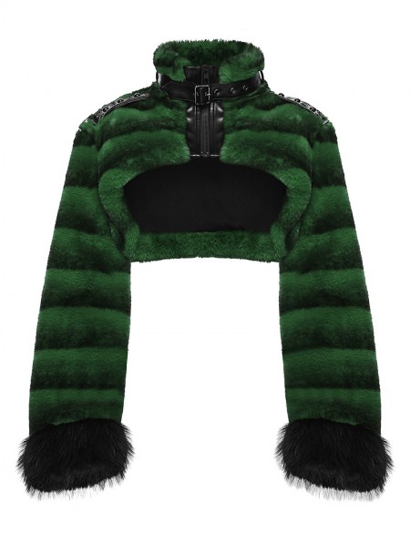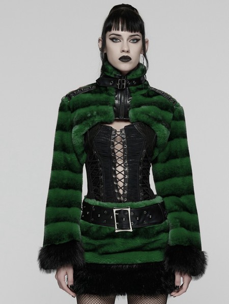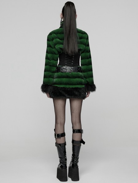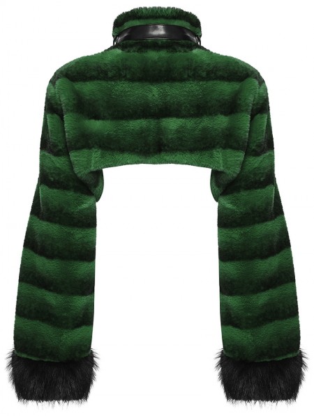 Punk Rave Black and Green Gothic Punk Striped Fluffy Fur Coat for Women