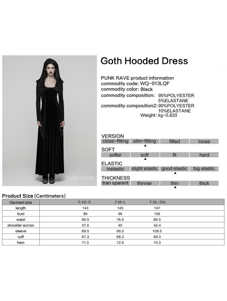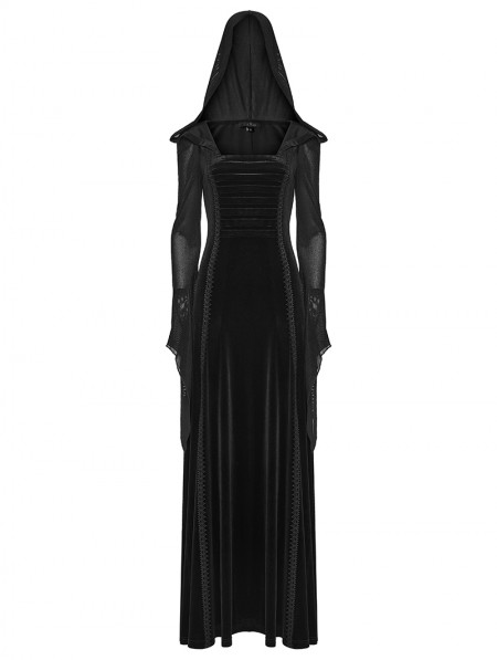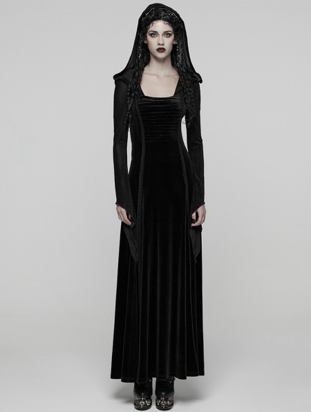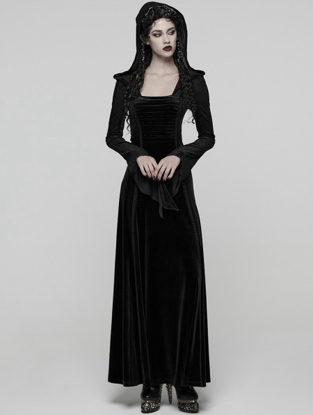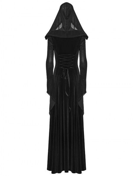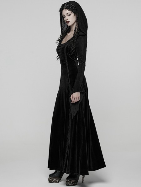 Punk Rave Black Gothic Hooded Ruched Velvet Long Dress