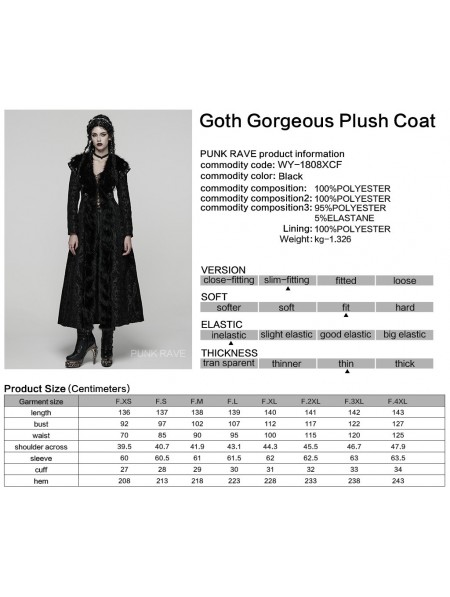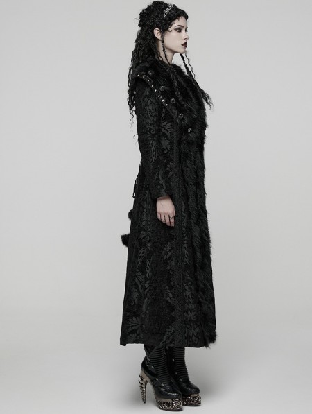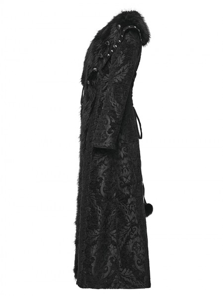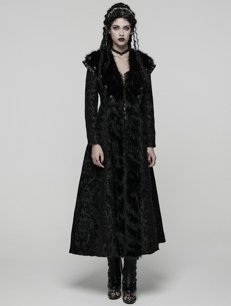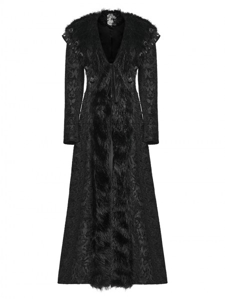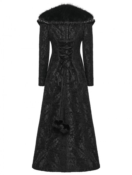 Punk Rave Black Retro Gothic Plush Trim Jacquard Long Winter Coat for Women