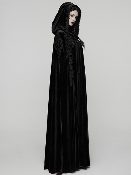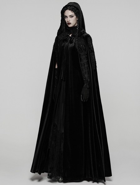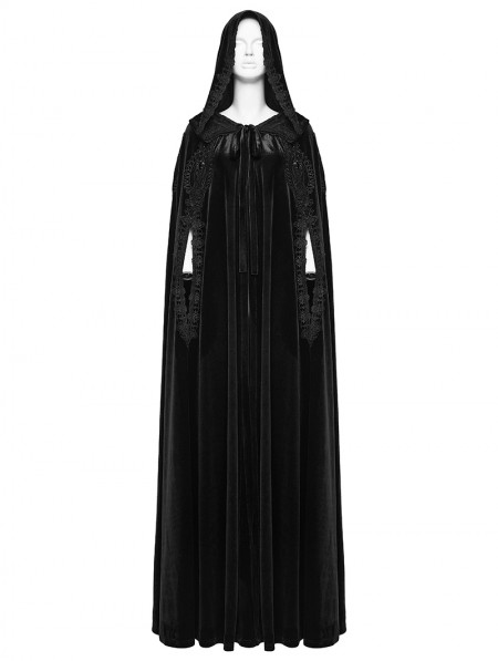 Punk Rave Black Gothic Embroidered Velvet Hooded Long Cloak for Women