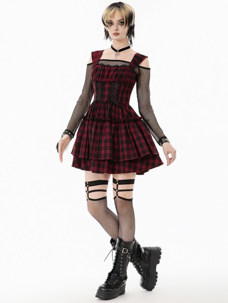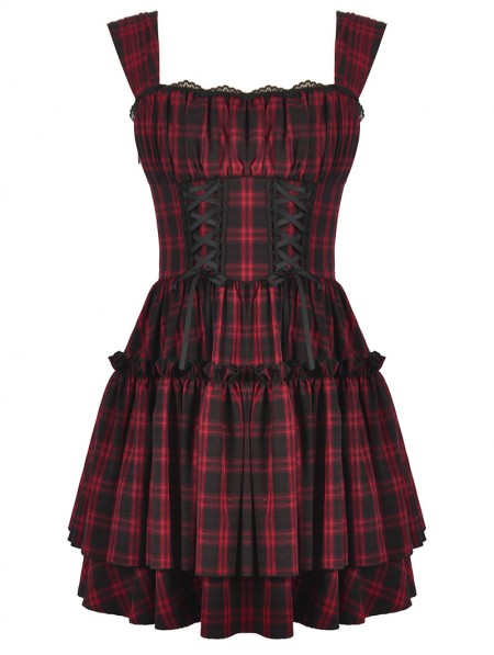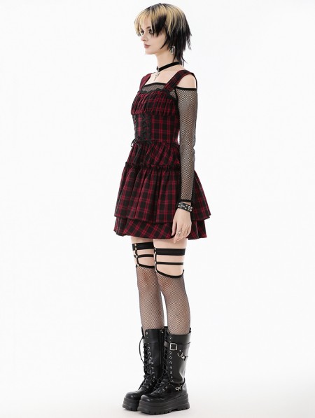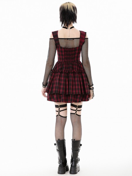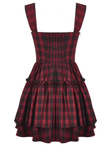 Dark in love Red and Black Plaid Gothic Ruched Layered Short Dress