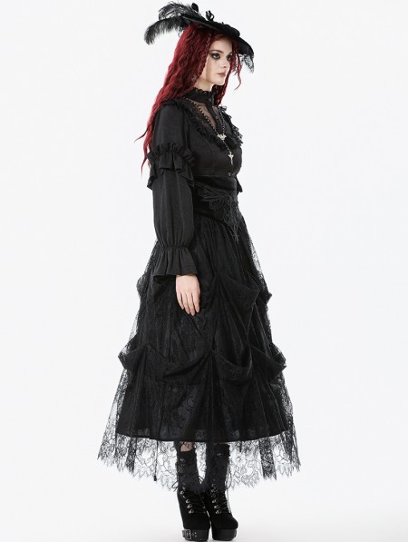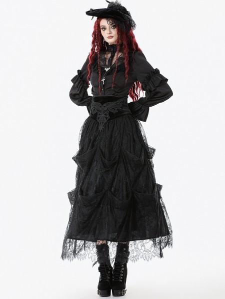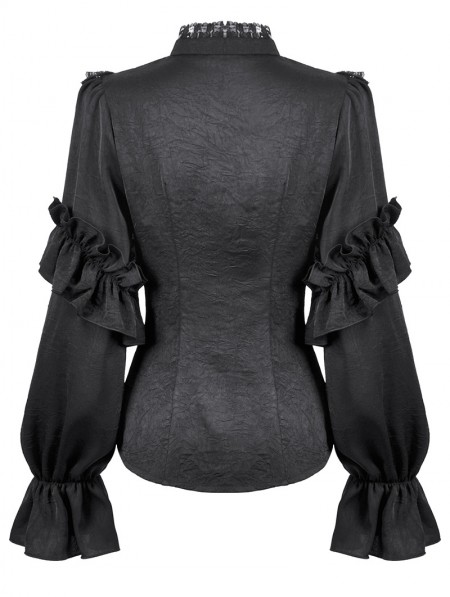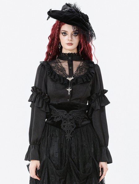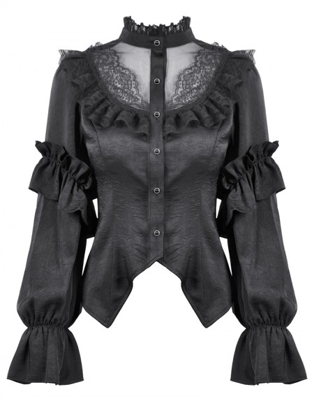 Dark in love Black Gothic Ruffled Lace Illusion Neck Blouse for Women