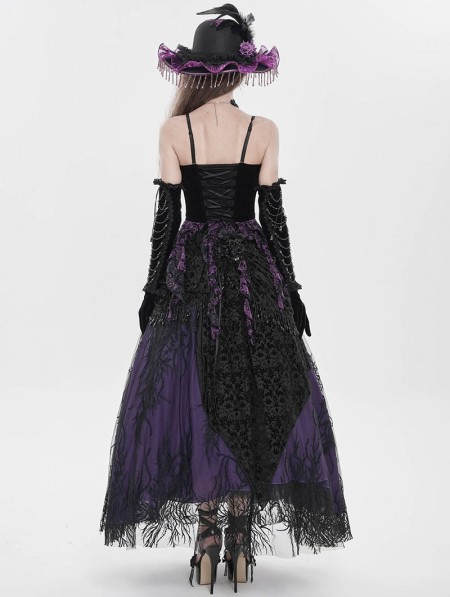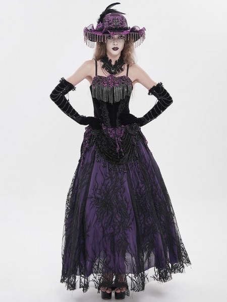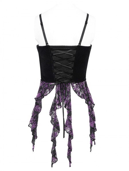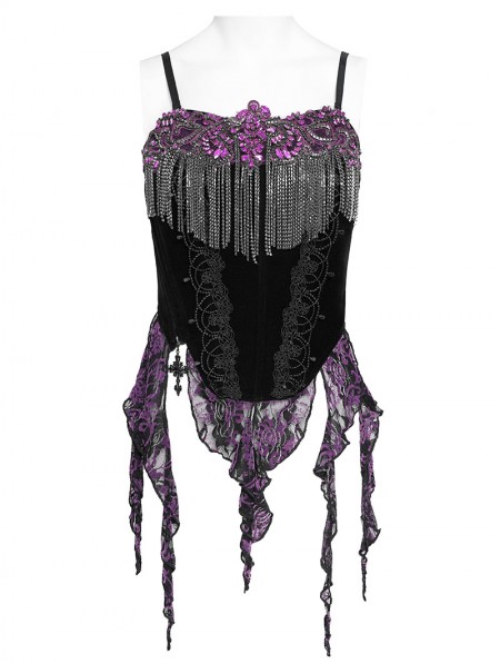 Eva Lady Black and Purple Retro Gothic Floral Beaded Tassel Velvet Corset Top