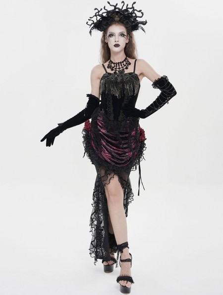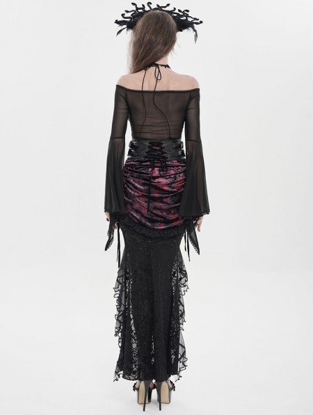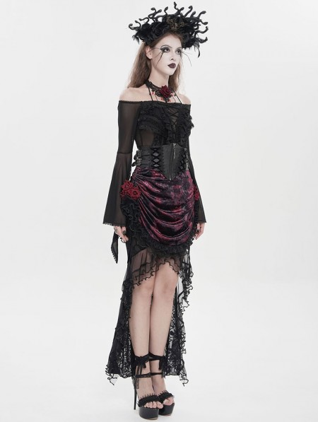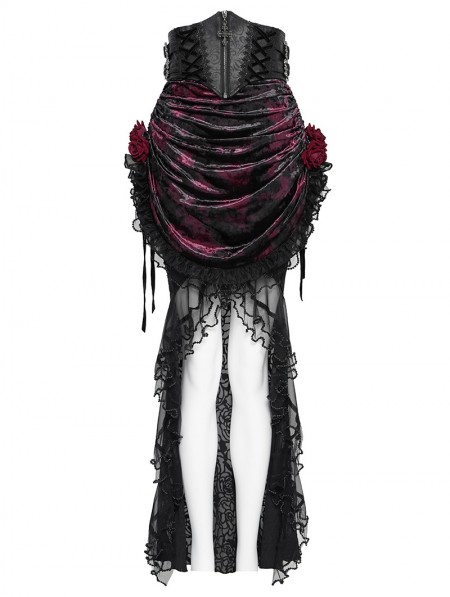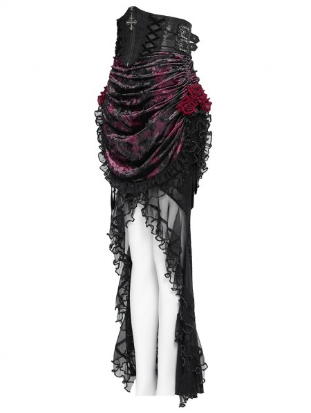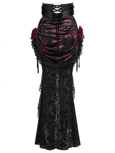 Eva Lady Black and Red Gothic Rose Mesh Velvet High-Low Fishtail Skirt