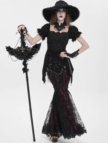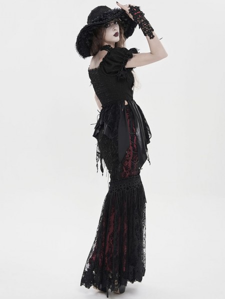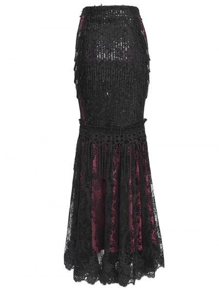 Eva Lady Black and Red Gothic Floral Lace Embroidered Tasseled Fishtail Skirt