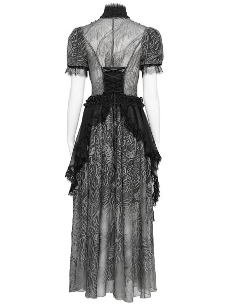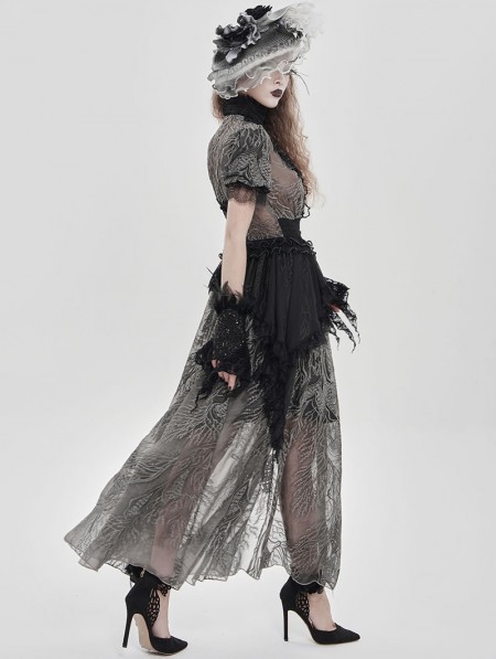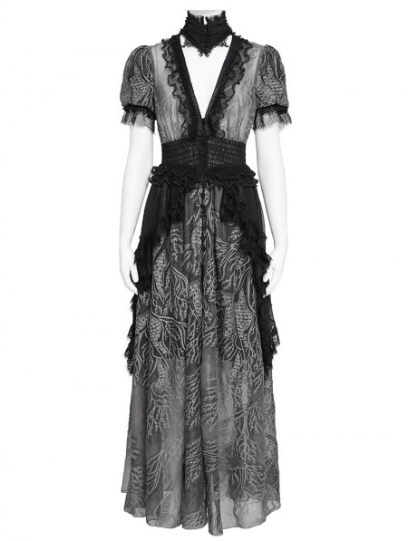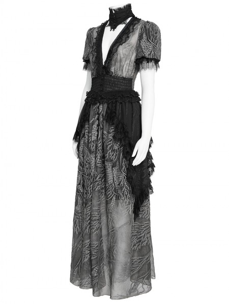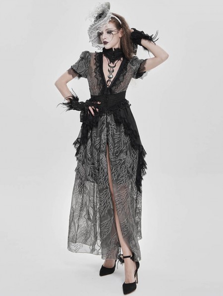 Eva Lady Black and Grey Gothic Deep V-Neck High Slit Floral Mesh Long Dress