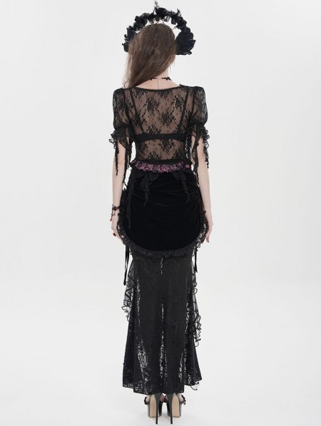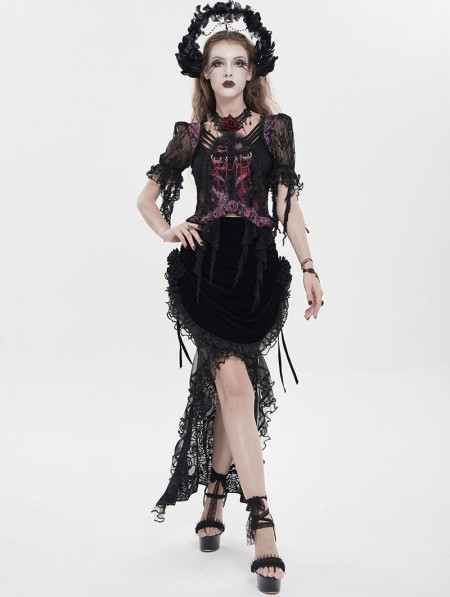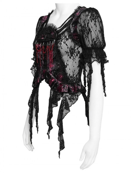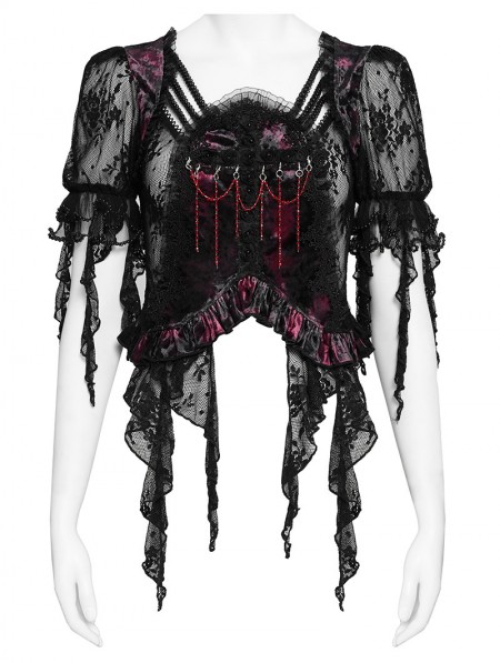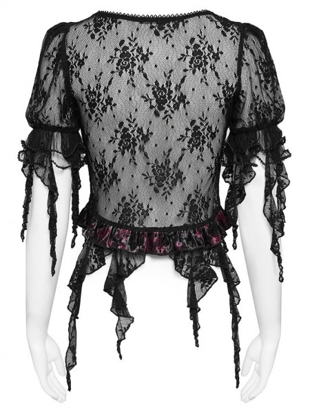 Eva Lady Black and Red Gothic Floral Mesh Ruffled Tassel Trim Shirt for Women