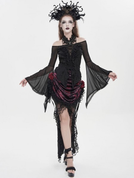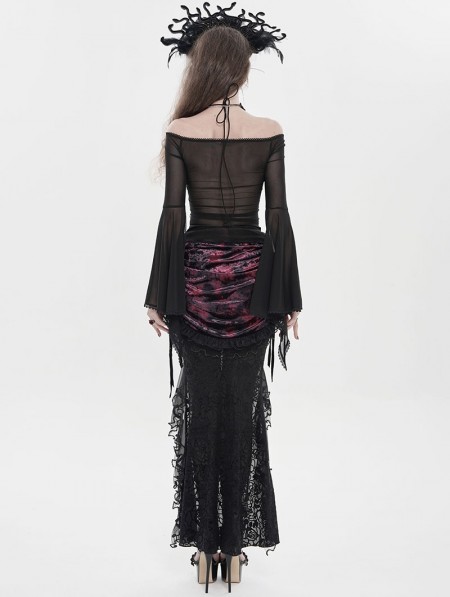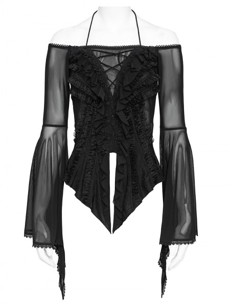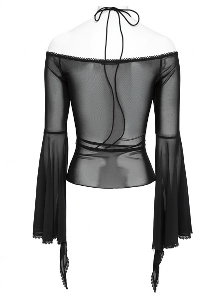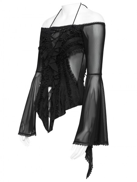 Eva Lady Black Gothic Mesh Halter Long Sleeve Peplum Top for Women
