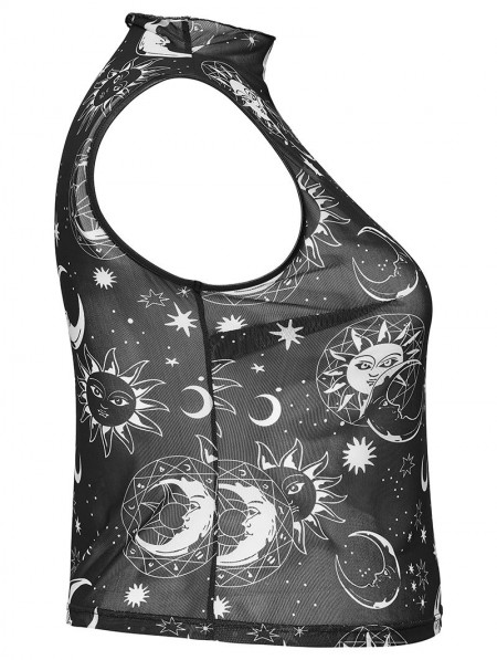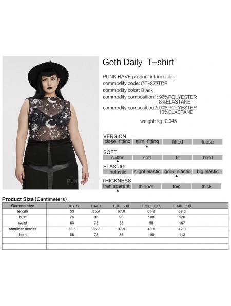 Punk Rave Black Gothic Daily Print Fitted Sleeveless Mesh Plus Size T-Shirt for Women