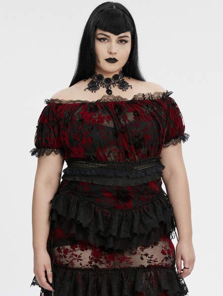 Punk Rave Black and Red Gothic Sexy Flocking Mesh Lace Trim Plus Size Short Top for Women