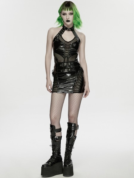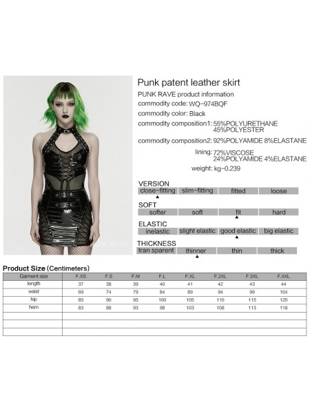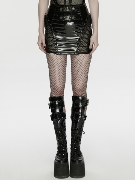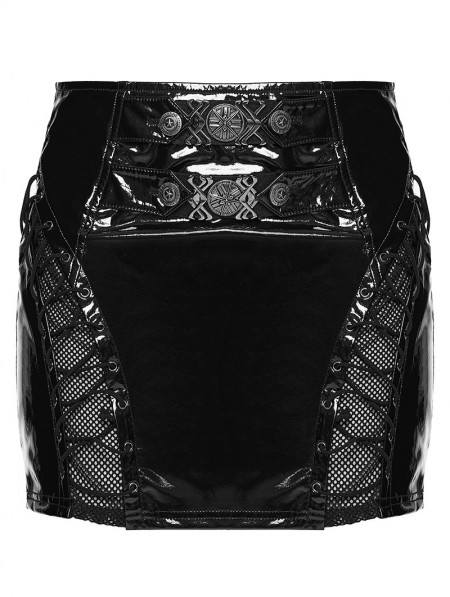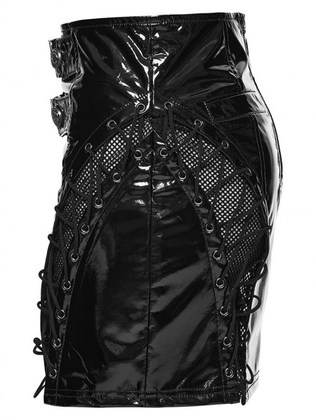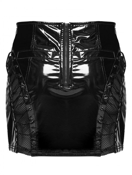 Punk Rave Black Gothic Punk Mesh Spliced Glossy Patent Leather Mini Skirt