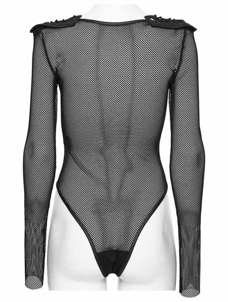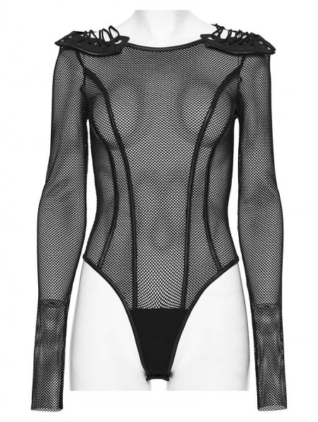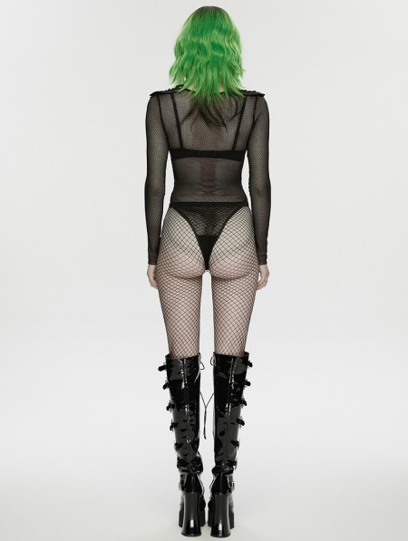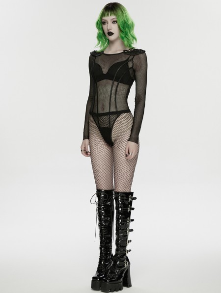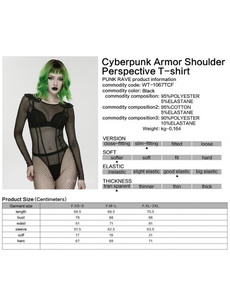 Punk Rave Black Gothic Cyberpunk Armor Shoulder Perspective T-Shirt for Women