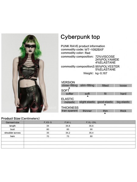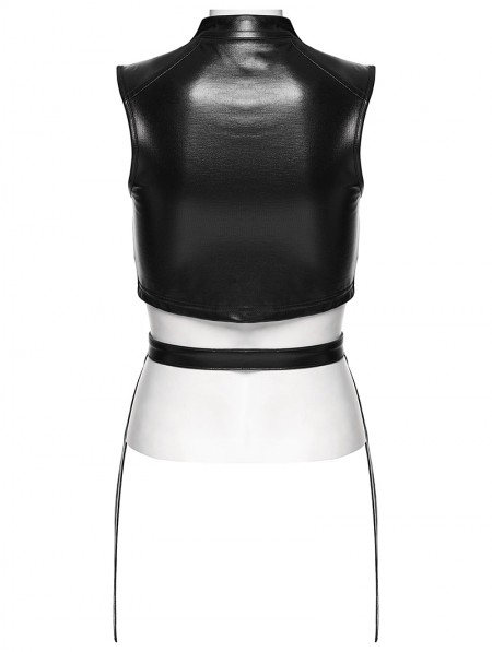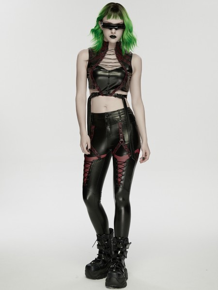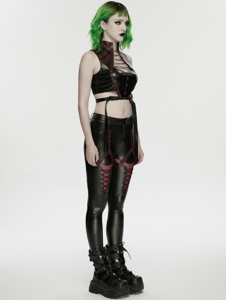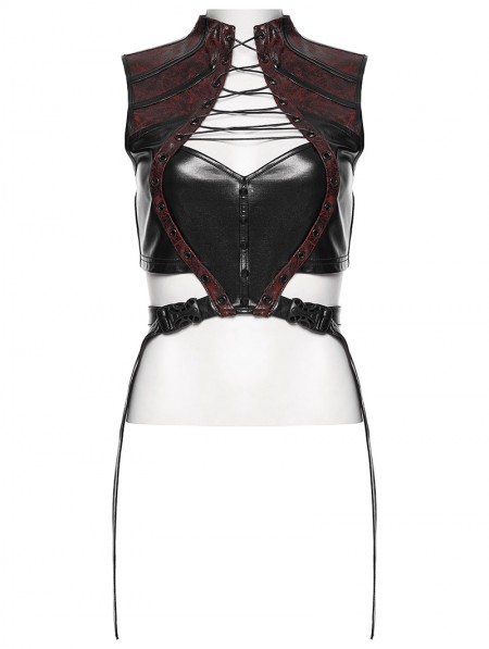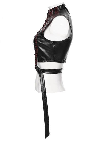 Punk Rave Black and Red Gothic Cyberpunk Buckled Cutout Leather Top for Women