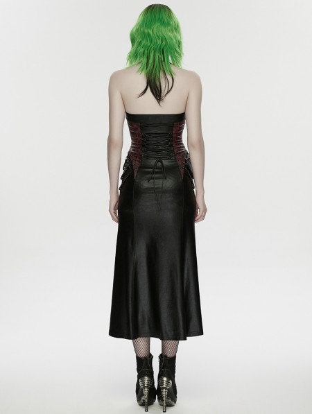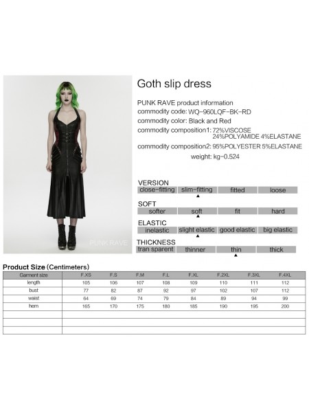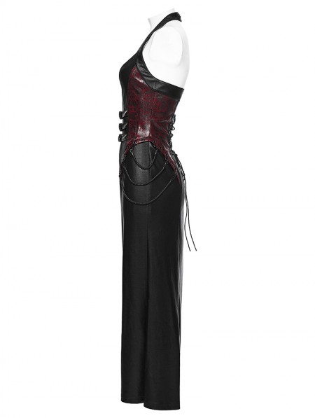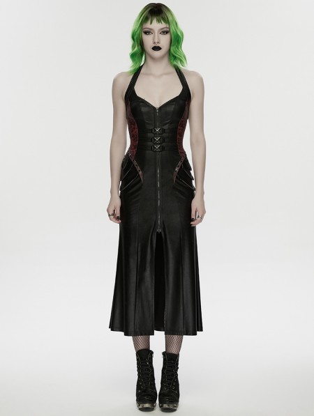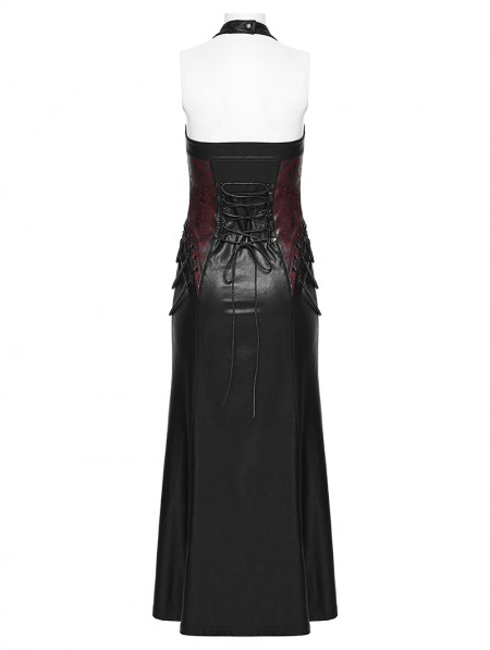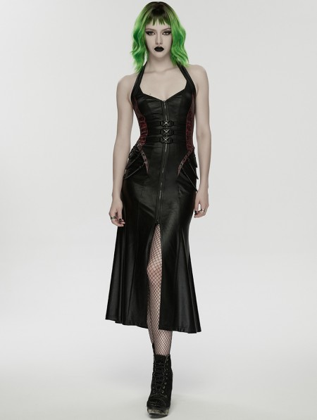 Punk Rave Black and Red Gothic Cyberpunk Zipper Split Halter Long Dress