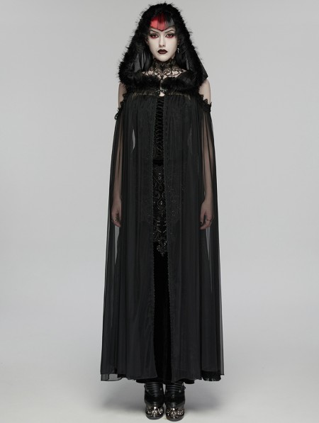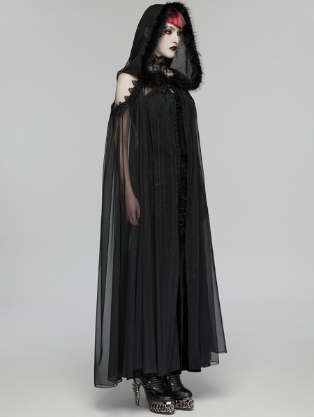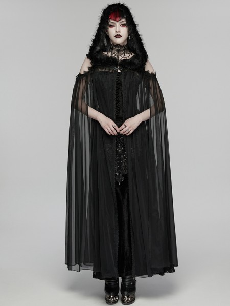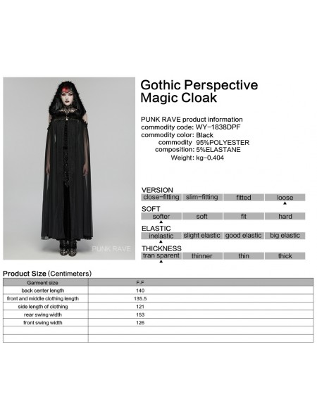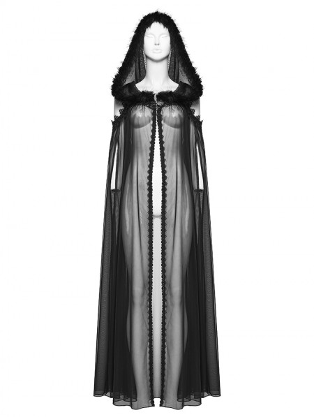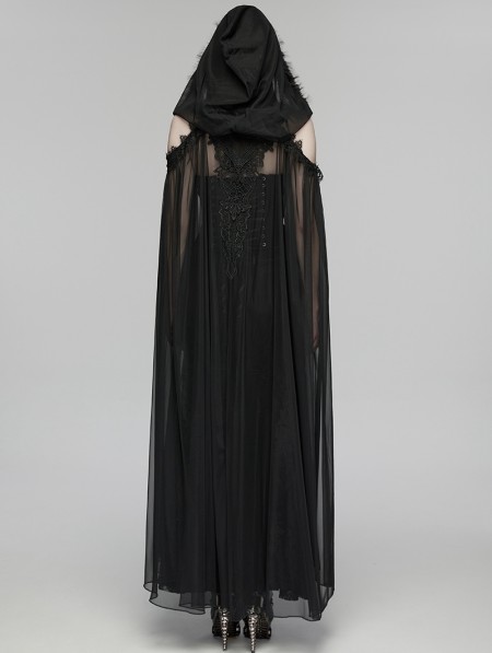 Punk Rave Black Gothic Perspective Mesh Magic Hooded Long Cape for Women