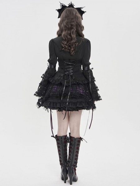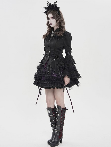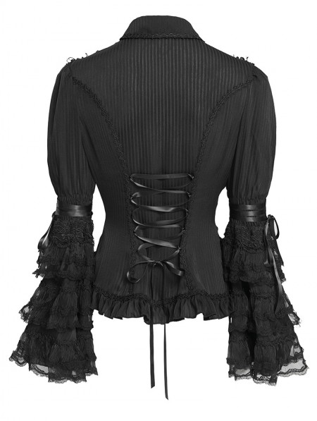 Devil Fashion Black Retro Gothic Long Flared Sleeve Beaded Ruffle Shirt for Women
