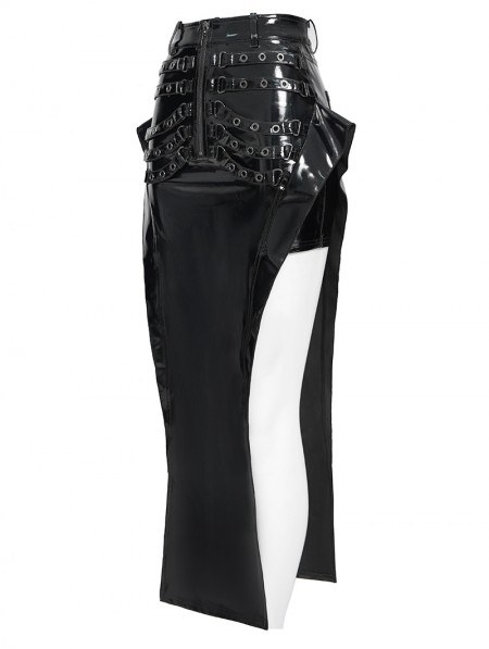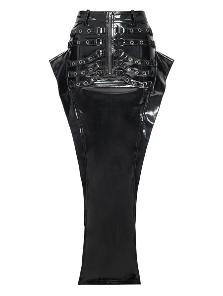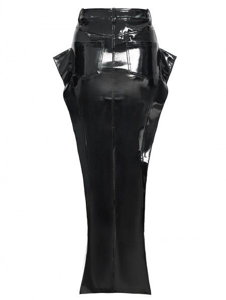 Devil Fashion Black Sexy Gothic Punk Eyelet Split Glossy Leather Long Skirt