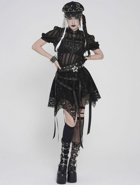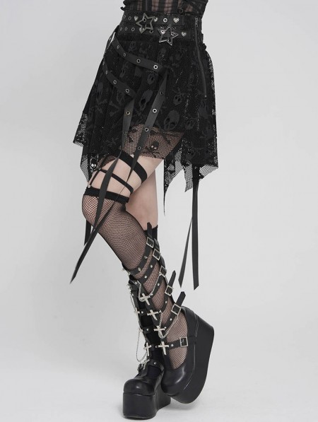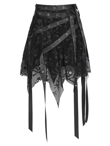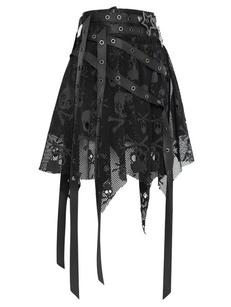 Devil Fashion Black Gothic Skull Mesh Asymmetric Eyelet Strap Punk Skirt