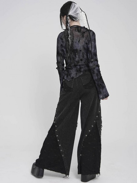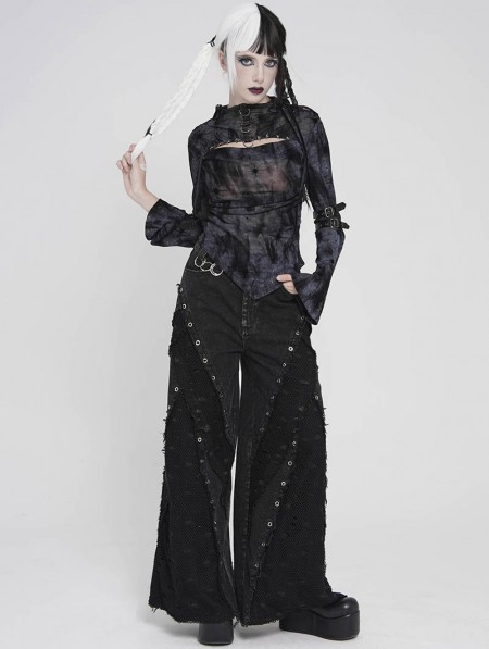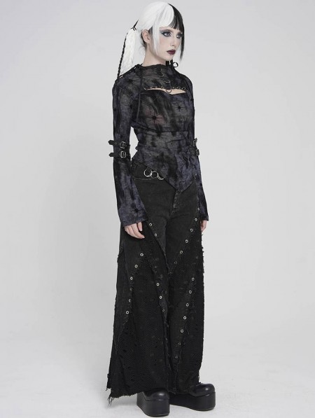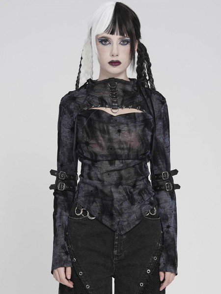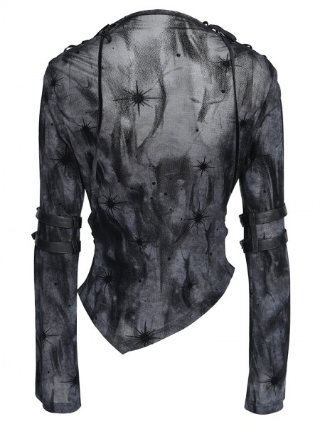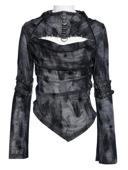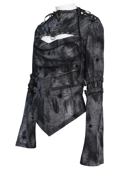 Devil Fashion Black Gothic Cut Out Ruched Long Sleeve T-Shirt for Women