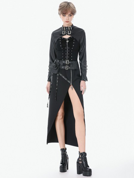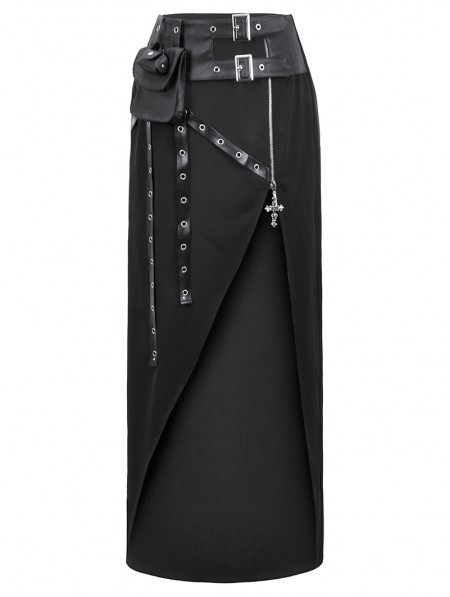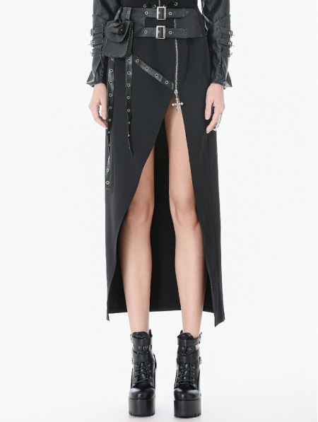 Dark in love Black Gothic Punk Utility Asymmetric Zip Slit Long Skirt