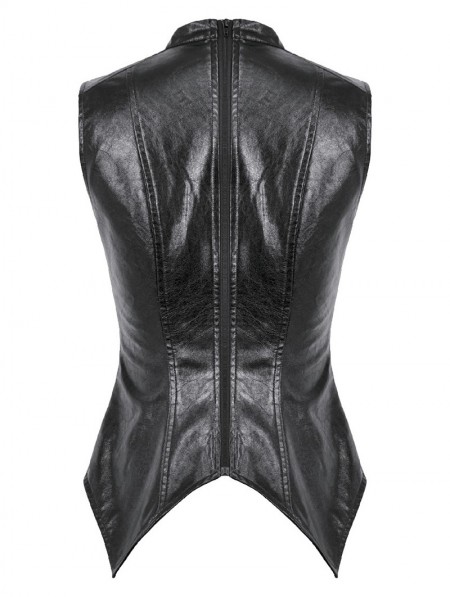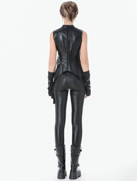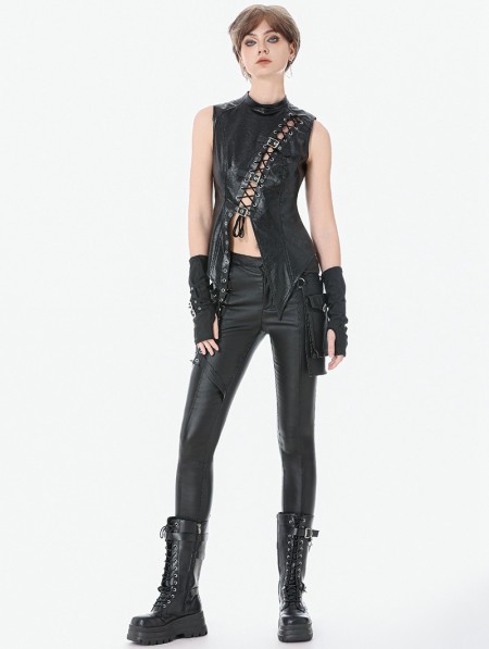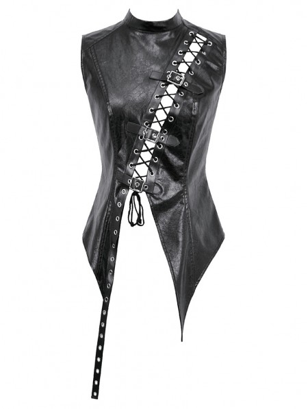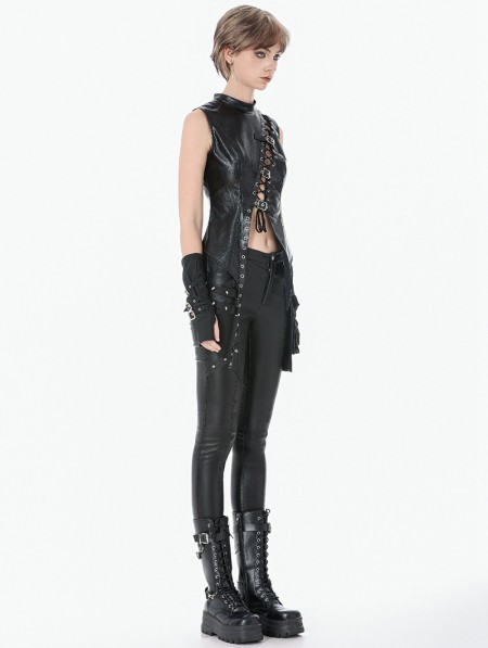 Dark in love Black Gothic Punk Distressed Leather Lace-Up Vest Top for Women