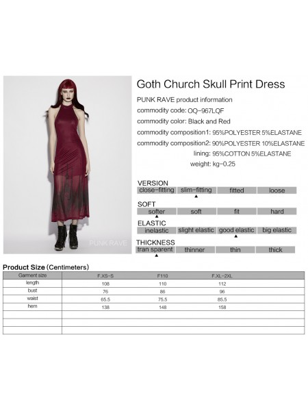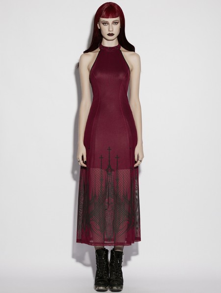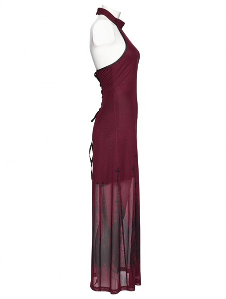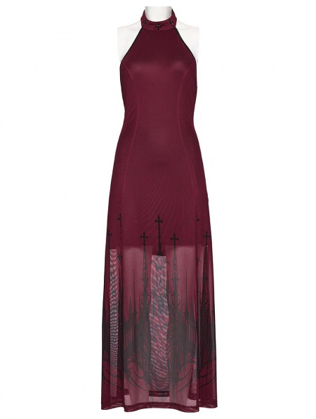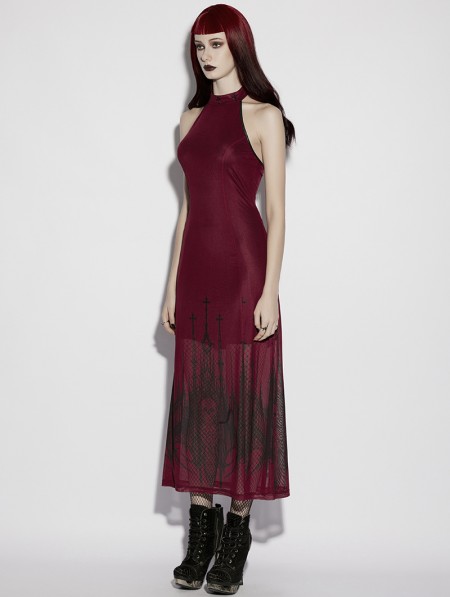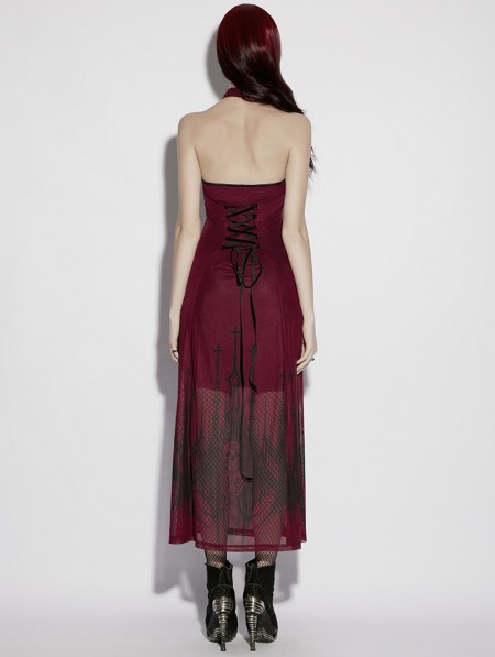Punk Rave Red Gothic Church Skull Print Mesh Halter Long Dress