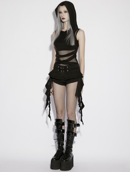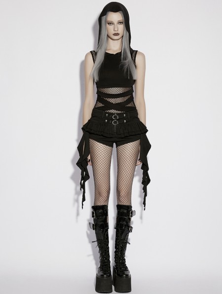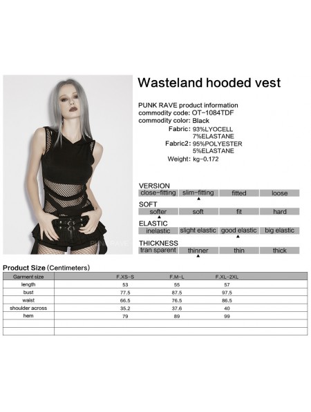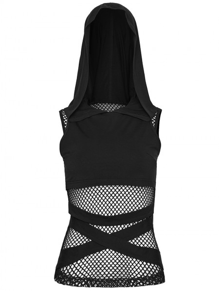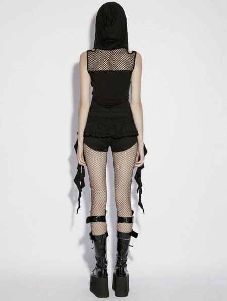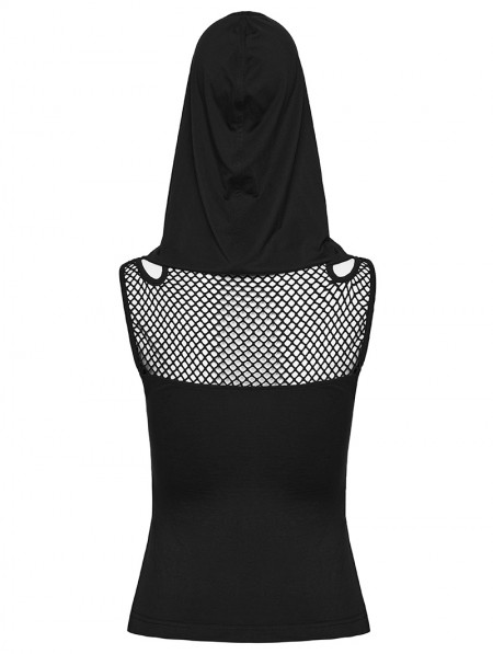 Punk Rave Black Gothic Wasteland Mesh Hooded Vest Top for Women
