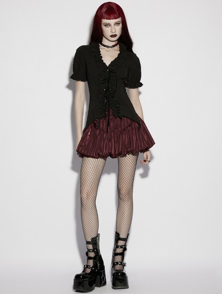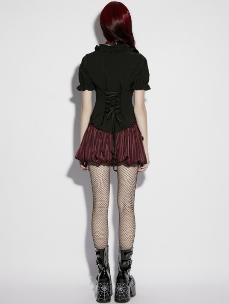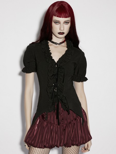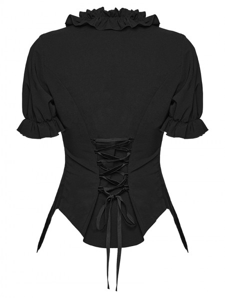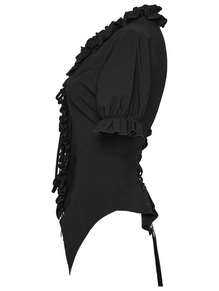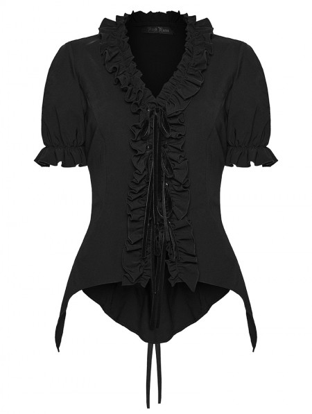 Punk Rave Black Gothic Daily Irregular Ruffle Tie-Up Short Sleeve Shirt for Women