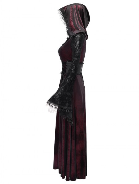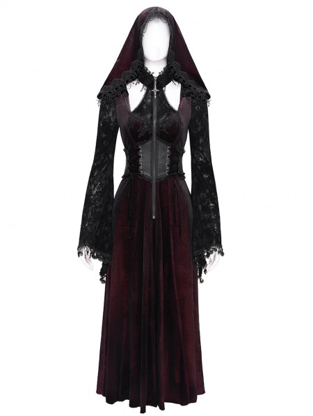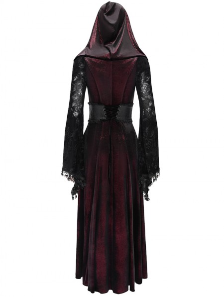 Devil Fashion Red Gothic Velvet Hollow Out Flared Sleeve Hooded Long Coat for Women