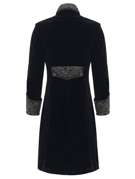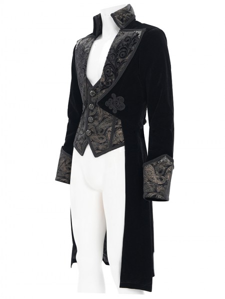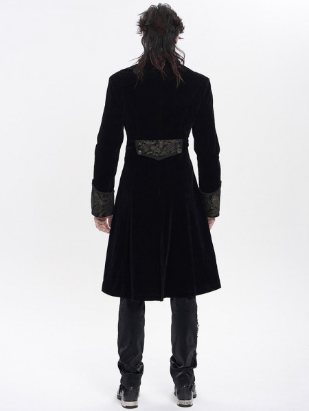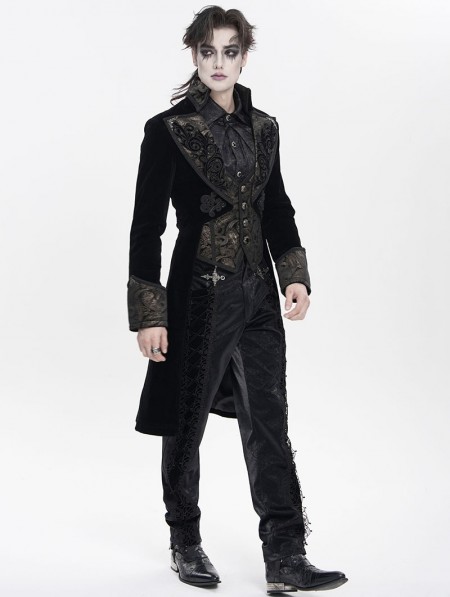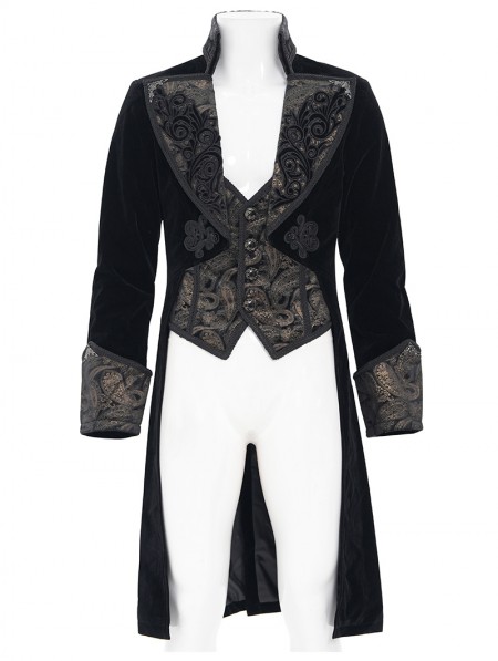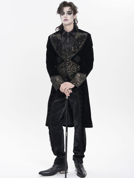 Devil Fashion Black and Gold Brocade Retro Gothic Velvet Tailcoat for Men